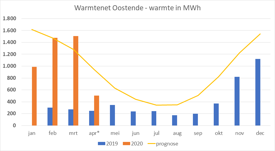 Maandelijkse warmteverkoop en verkoopprognose per maand (data tot 14 april 2020):